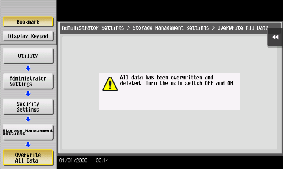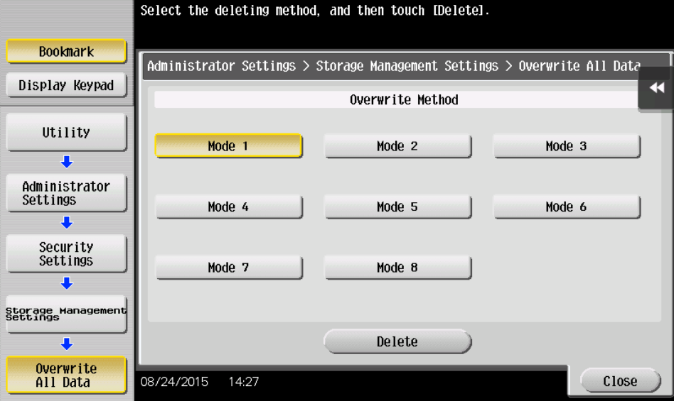 Меню->Утилиты->Настройки администратора->Настройки безопасности->Настройки НЖМД->Перезаписать все данные, далее выбрать режим и нажать "Удалить" ,
