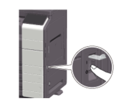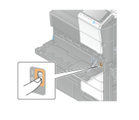 Кнопка расположена под передней крышкой с надписью bizhub, справа от бункера для отработанного тонера