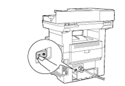Кнопка расположена на задней стенке МФУ, рядом с проводом питания