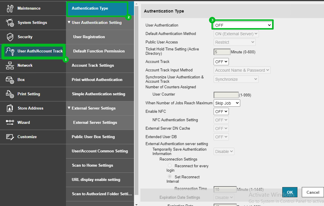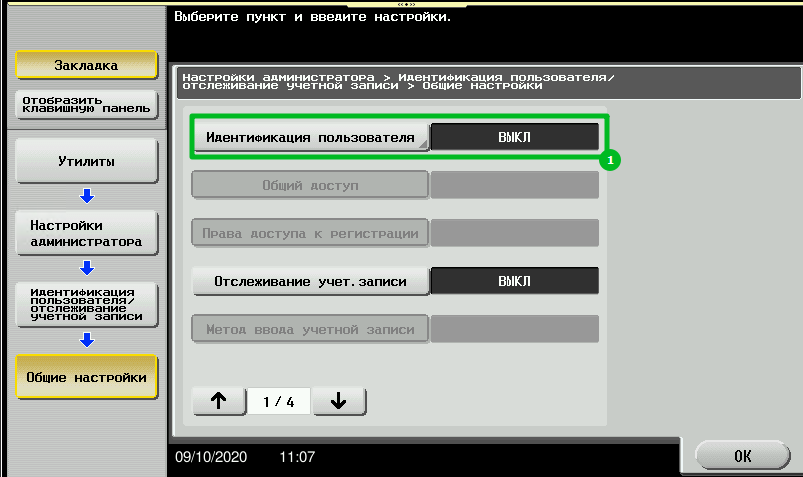 Либо на панели МФУ, Меню(домик)->Утилиты->Настройки администратора->Настройки авторизации\учетной записи->Общие настройки->Идентификация пользователя, выставить ВЫКЛ