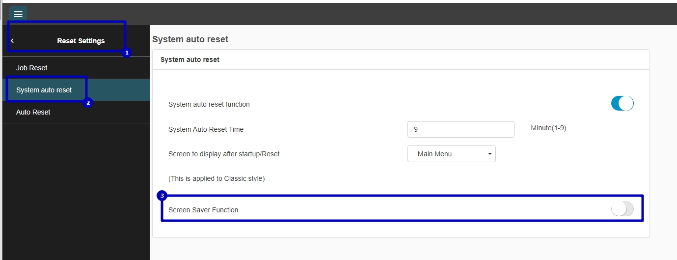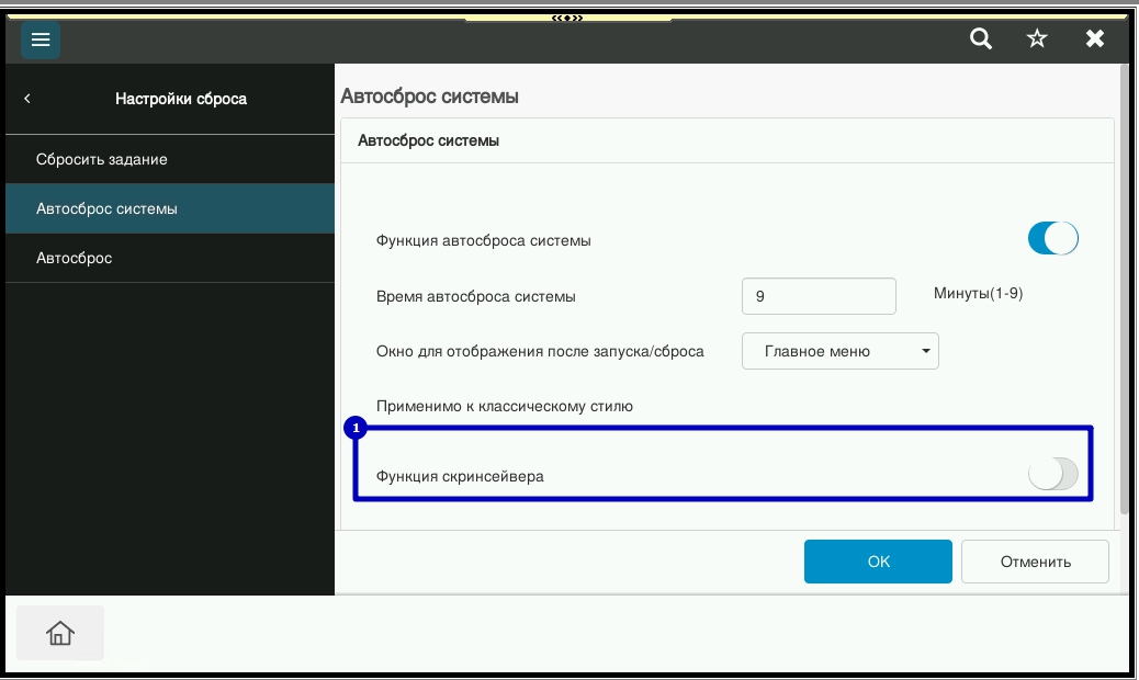 Настройки(шестеренка)->Админ->Настройки системы->Настройки сброса->Автосброс системы->Функция скринсейвер переключить в ВЫКЛ