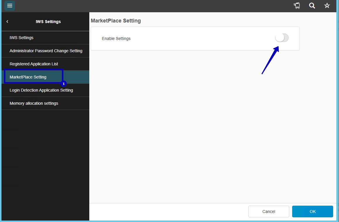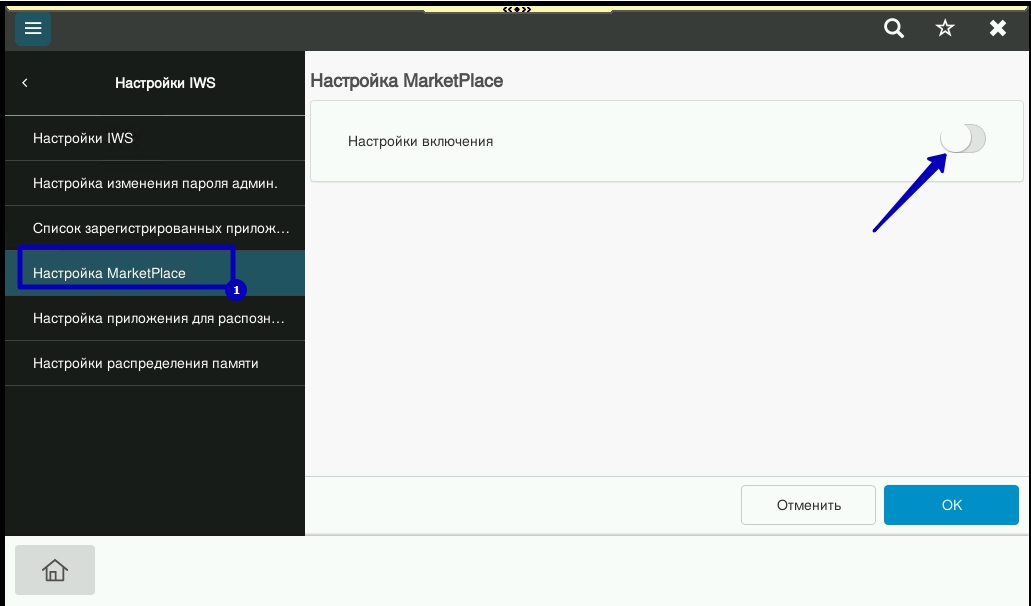 Настройки(шестеренка)->Админ->Настройки сети->Настройки IWS->Настройка MarketPlace->Настройки включения переключить в ВЫКЛ
