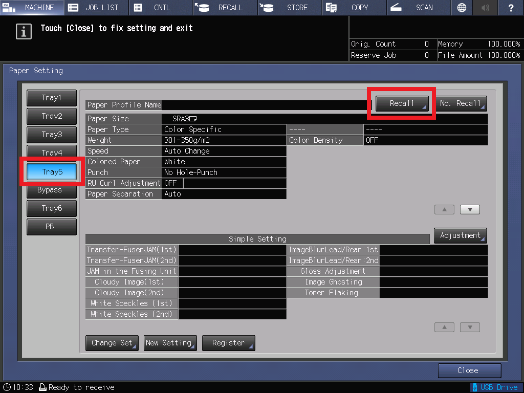 Для этого перейдите в меню настройки лотков и выберите лоток из которого будут подаваться конверты (в примере лоток №5) и нажмите кнопку "Recall"