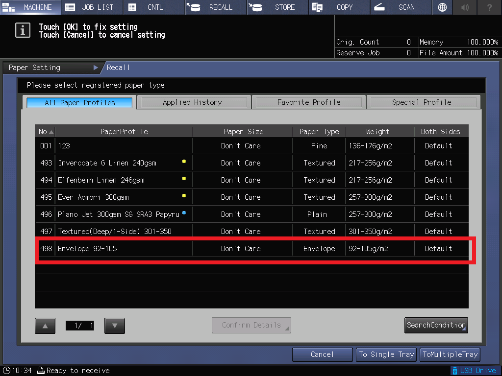 Внимание! Подача конвертов доступна не из всех лотков, при невозможности подачи конвертов выбрать профиль будет невозможно.