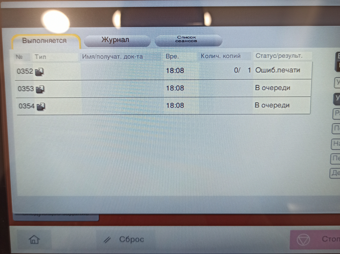 На самом устройстве в списке заданий можно увидеть ошибку печати