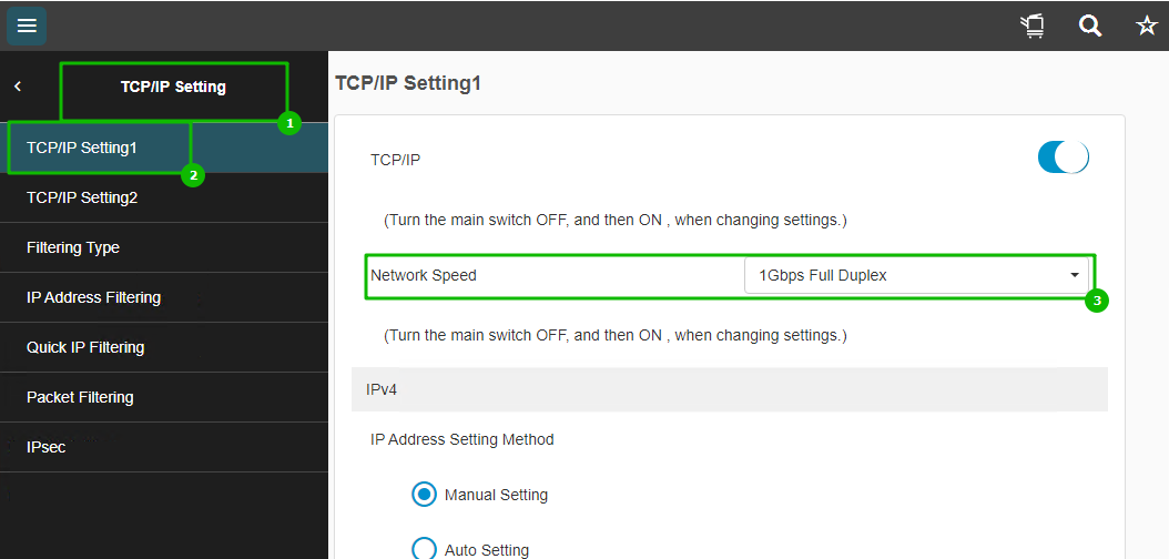 1. Network->TCP\IP Setting->TCP\IP Setting1->Network Speed, выставить 1Gbps Full Duplex