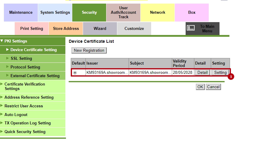 1. В веб-интерфейсе, в режиме администратора Security->PKI Settings->Device Certificate Settings проверить, что на МФУ зарегистрирован сертификат: