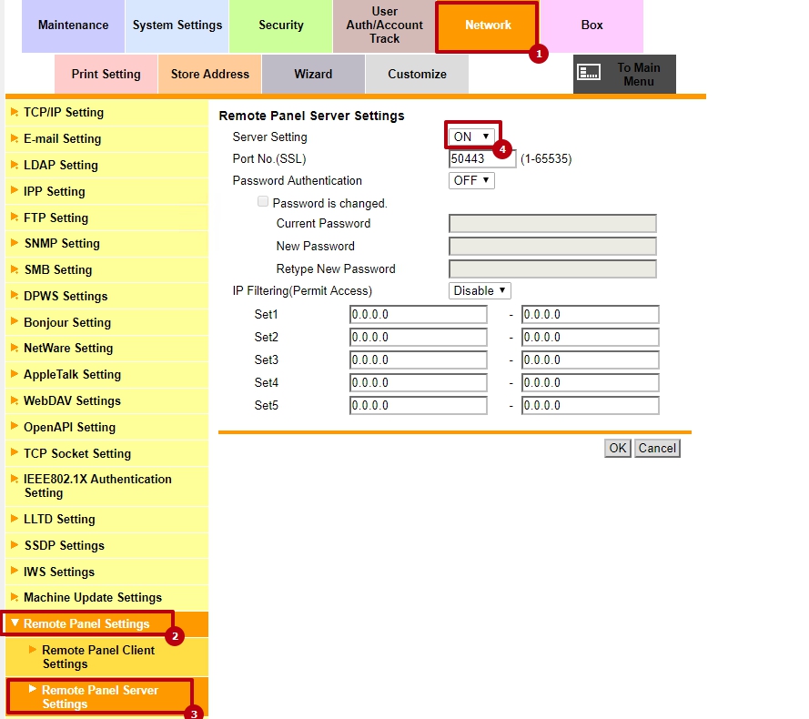 2. В веб-интерфейсе, в режиме администратора, Network->Remote Panel Settings->Remote Panel Server переключить настройку Server Setting в On