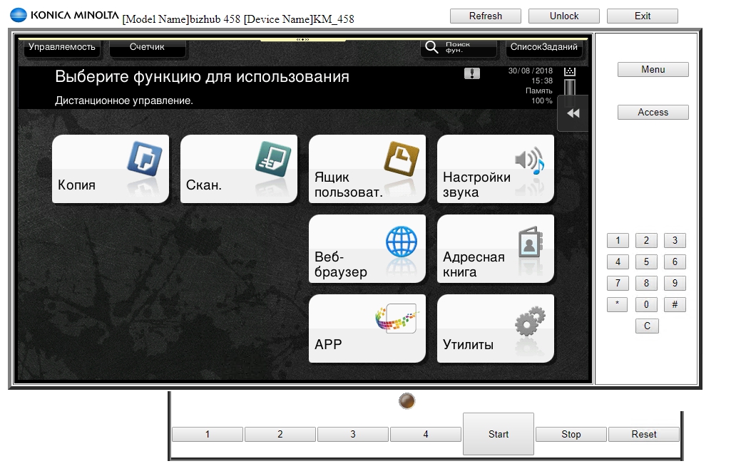 После этого в браузере, по ссылке https://ип_принтера:50443/panel/remote_panel.cgi будет доступна панель МФУ: